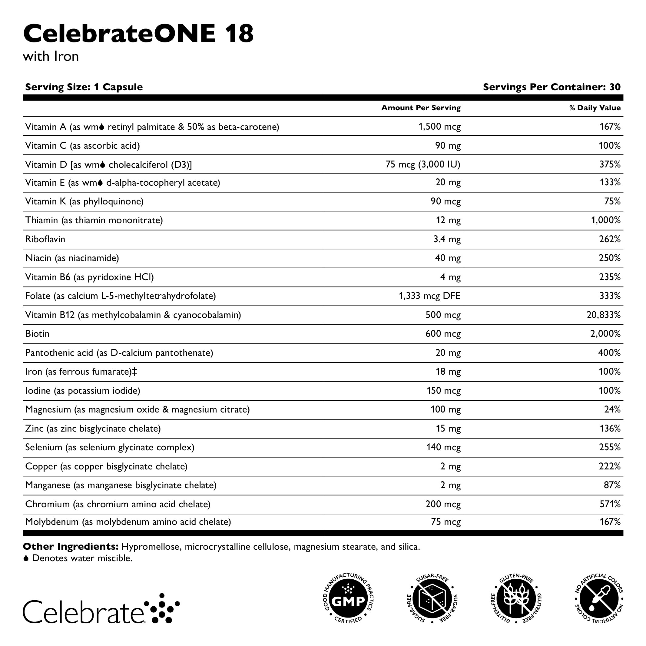 Kapsuly CelebrateONE 18 multivitamínov s obsahom železa poskytujú kompletnú zmes esenciálnych vitamínov a minerálov, vrátane 18 mg železa pre tých, ktorí potrebujú nižšiu dávku železa, všetko v pohodlnej dávke raz denne.